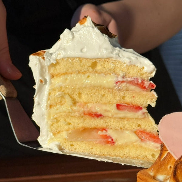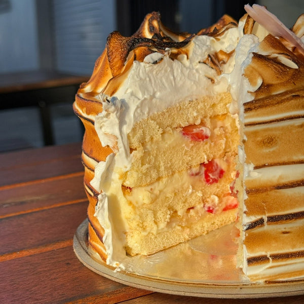 Our Vanilla Charlotte with a Meringue Finish is here to stay! This celebration cake is made with layers of soft vanilla sponge, fresh strawberries and vanilla patisserie custard - finished with a torched Italian Meringue.